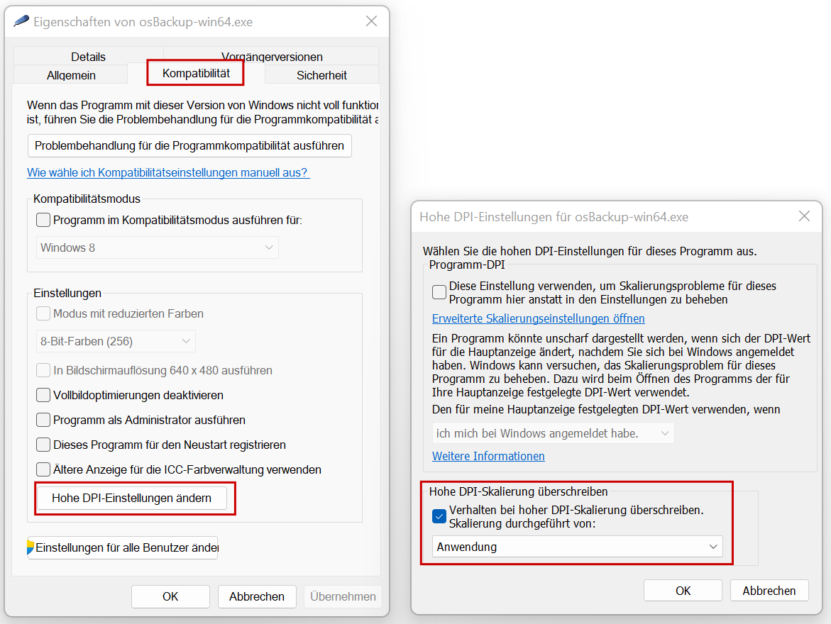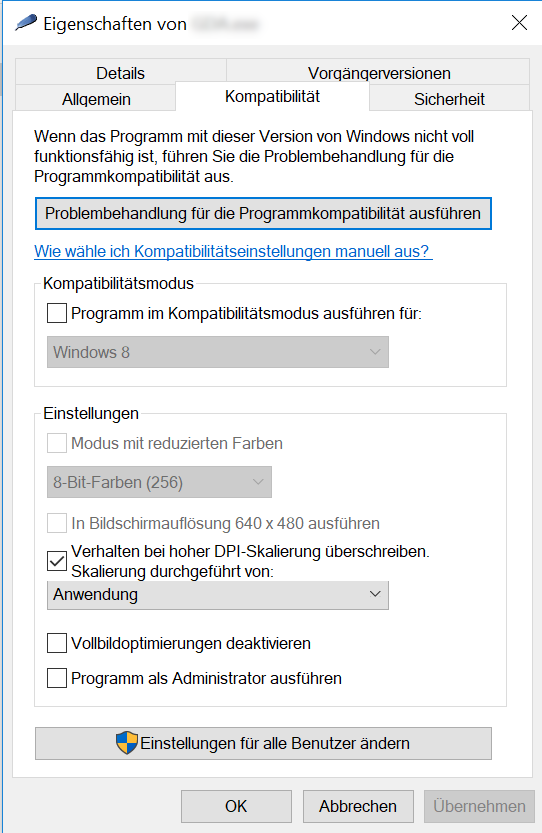 Klicken Sie mit der rechten Maustaste auf die Programmdatei und wählen im Kontextmenü die Lasche "Kompatibilität" aus. Dort klicken Sie auf den Button "Hohe DPI-Einstellungen ändern". Im folgenden Dialogfenster setzen Sie einen Haken bei "Verhalten bei hoher DPI-Skalierung überschreiben". Übernehmen Sie die Einstellung und starten Sie dann das Programm neu. Jetzt ist die Schrift scharf.