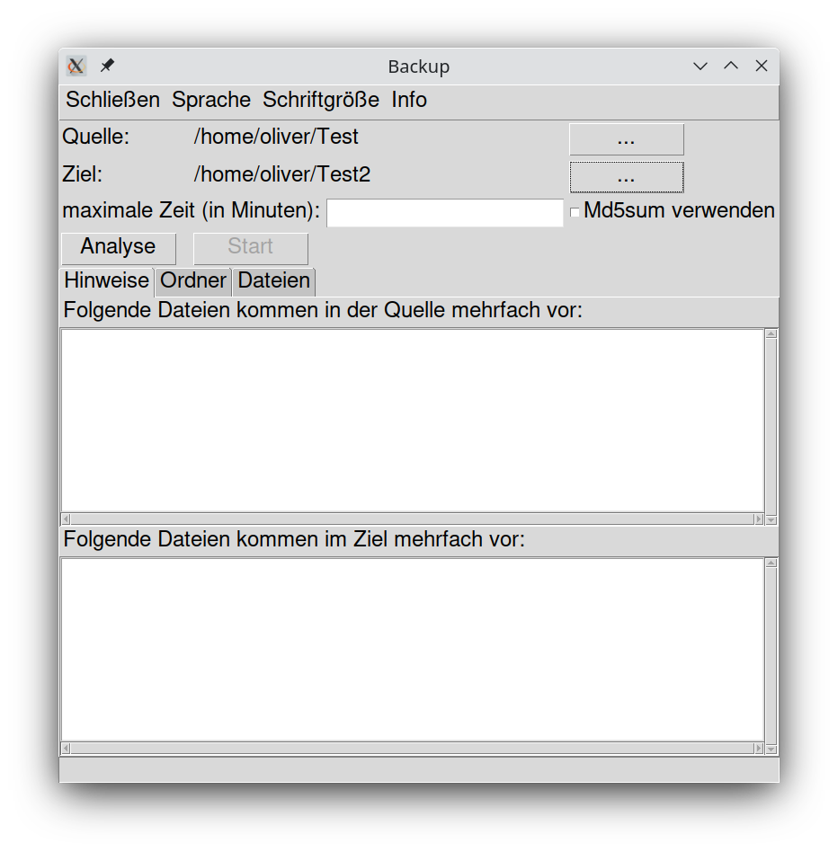 Analyse: Der Button startet die Analyse. Es wird noch kein Backup durchgeführt. Wenn Sie die Analyse durchgeführt haben, schauen Sie sich die Reiter Hinweise, Ordner und Dateien an. Dort finden Sie die Vorgänge, die beim Backup ausgeführt werden, einzeln aufgeführt.