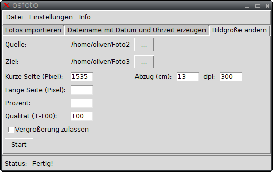 Wenn Sie z. B. Abzüge erstellen lassen möchten und die schmale Seite 13 cm lang sein soll, dann geben Sie im Feld "Abzug (cm)" die Zahl 13 ein. Im Feld "dpi" können Sie die Auflösung des Druckers festlegen. In der Regel sind das 300 dpi. Das Programm berechnet dann automatisch die Anzahl der Pixel für die kurze Seite, in diesem Fall 1535 Pixel.