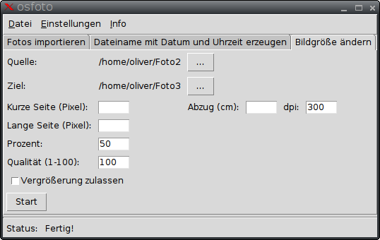 Auf dem Reiter "Bildgröße ändern" können Sie die Bildgröße ändern. Wählen Sie wieder den Quell- und den Zielordner aus. Danach legen Sie fest, wie groß das Foto werden soll und klicken dann auf den Start-Button.